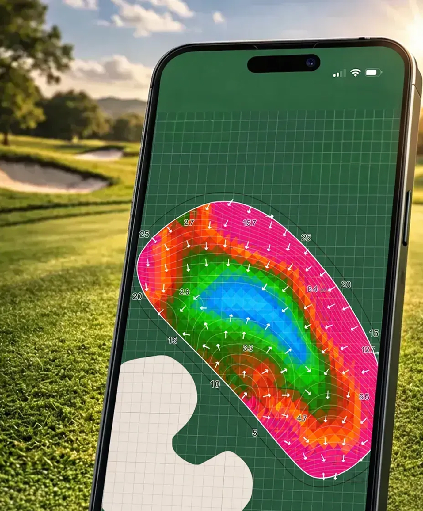 Green slope maps provide a visual overview of a green’s topography — including elevation changes, tilt direction, and contour flow.